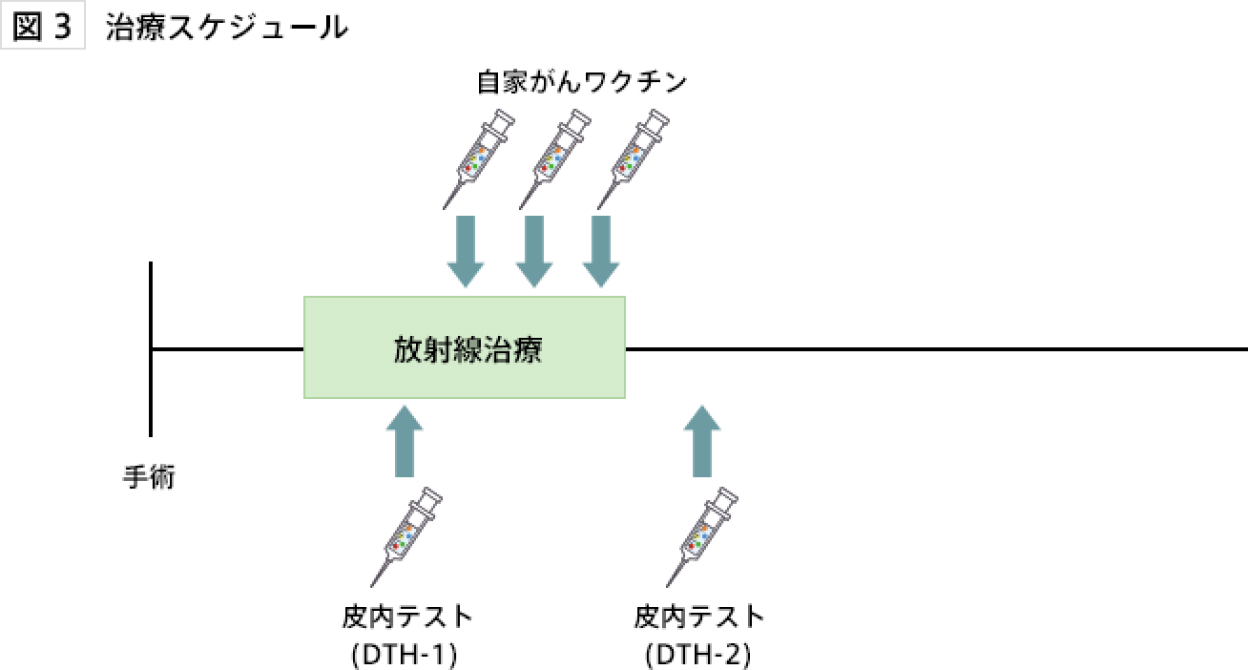 投与スケジュールは、手術後の放射線治療と同時に自家がんワクチンを1週間間隔で3回投与することとし、その前後に皮内テストを実施しました。