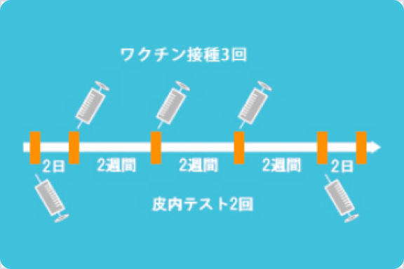 1コースでは、免疫反応テスト(皮内テスト)2回、ワクチン本体の接種3回の計5回の皮内注射(※)を行います。病院によっては、免疫反応テストを省略する場合もあります。 通常は2週間ごとに1回(急ぐ場合は1週間ごとや10日に1回でも可)、皮内5ヶ所に、自家がんワクチンを注射します。全治療期間は約6週間となります。
